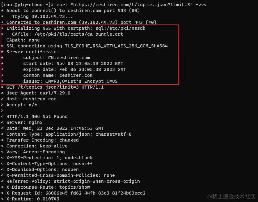 有人对http与https还是很模糊,这里进行说明,首先用下面的curl命令访问ceshiren.com,你会看到它包含连接成功,服务器验证,加密连接等等,我称这些为加密。
