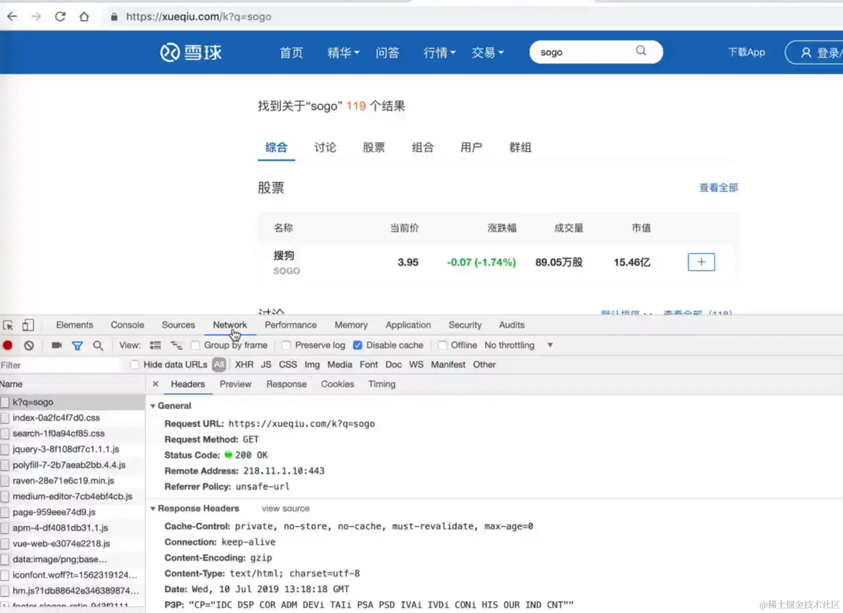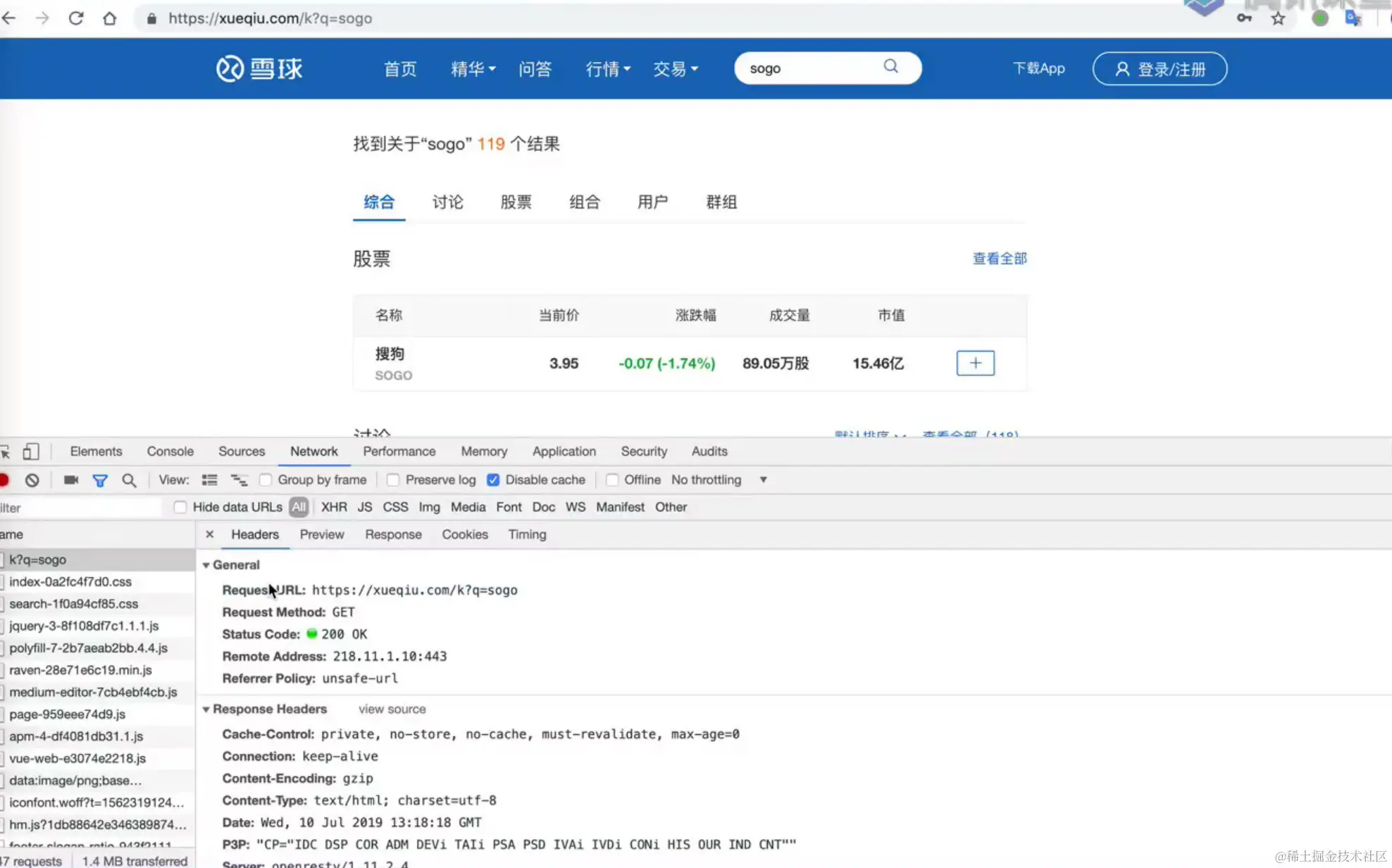 curl 'stock.xueqiu.com/v5/stock/ba…' -H 'Accept: /' -H 'Referer: xueqiu.com/k?q=sogo' -H 'Origin: xueqiu.com' -H 'User-Agent: Mozilla/5.0 (Macintosh; Intel Mac OS X 10_14_5) AppleWebKit/537.36 (KHTML, like Gecko) Chrome/75.0.3770.100 Safari/537.36' --compressed