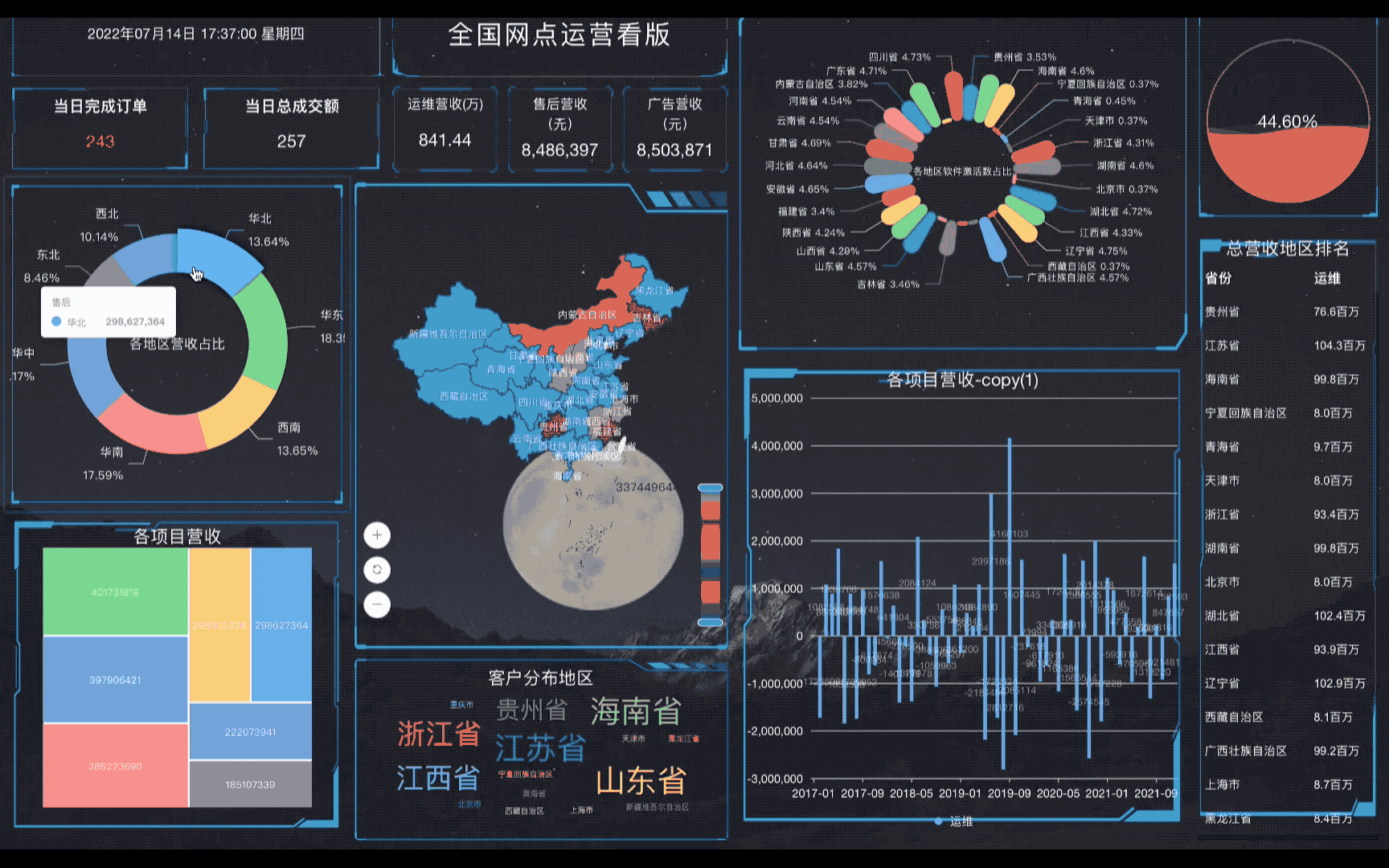对于 DataEase 展示的数据看板带来的视觉体验,我们主要从:仪表板展示、单个视图效果、终端展示效果、自定义组合视图效果,整体展示操作效果五个方面分析: