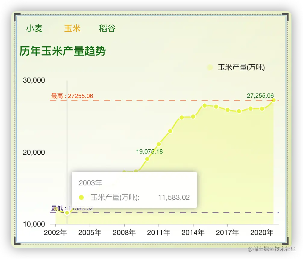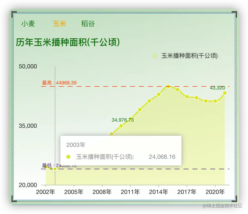 从玉米播种面积和产量图表中可以看到,玉米播种面积最低的是2003年为24068.16千公顷。播种面积最高的是2015年为44968.39千公顷。玉米产量最低的是2003年为11583.02万吨,产量最高的为2021年为27255.06万吨。