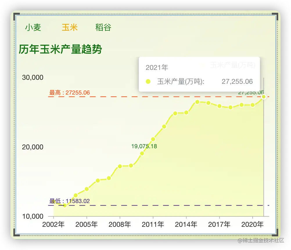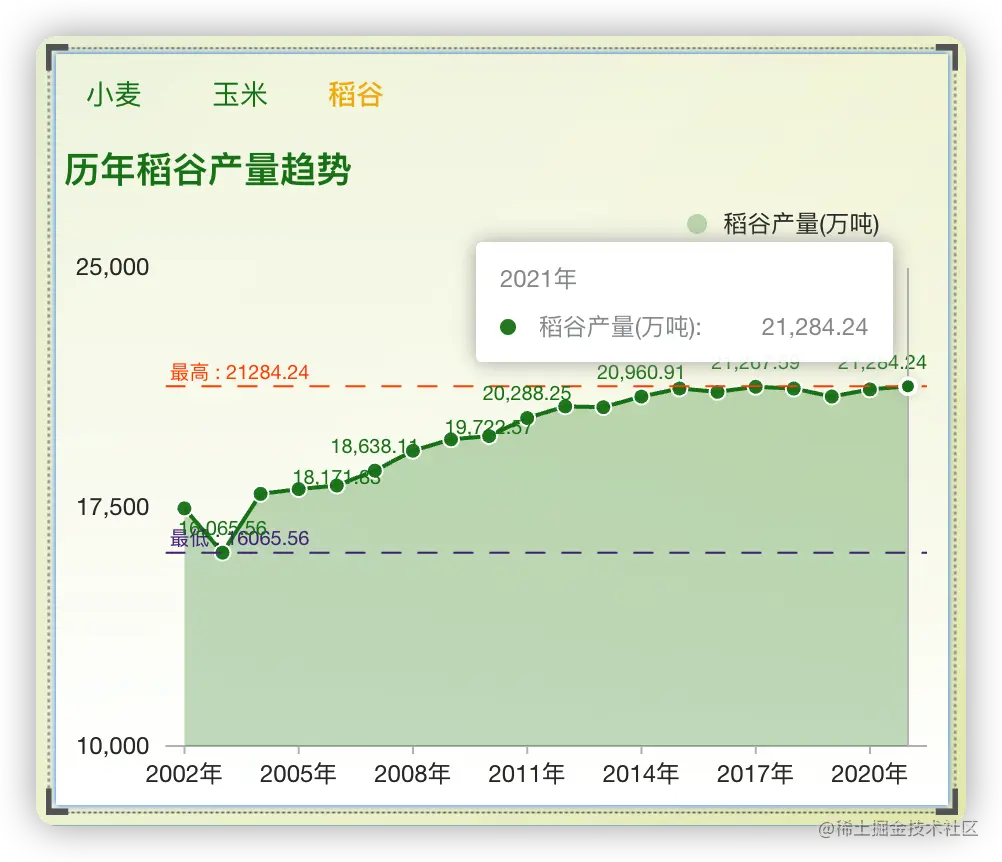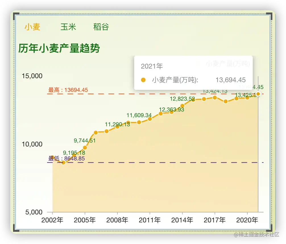 为了了解我国农业经济运行的全貌,我们使用DataEase开源数据可视化分析工具来制作一个仪表板,分析展示近几年小麦、玉米、稻谷等农作物的指标数据。由于今年秋收的相关数据还没出来,所以目前的数据统计截止至2021年(数据来源于国家统计局官网)。