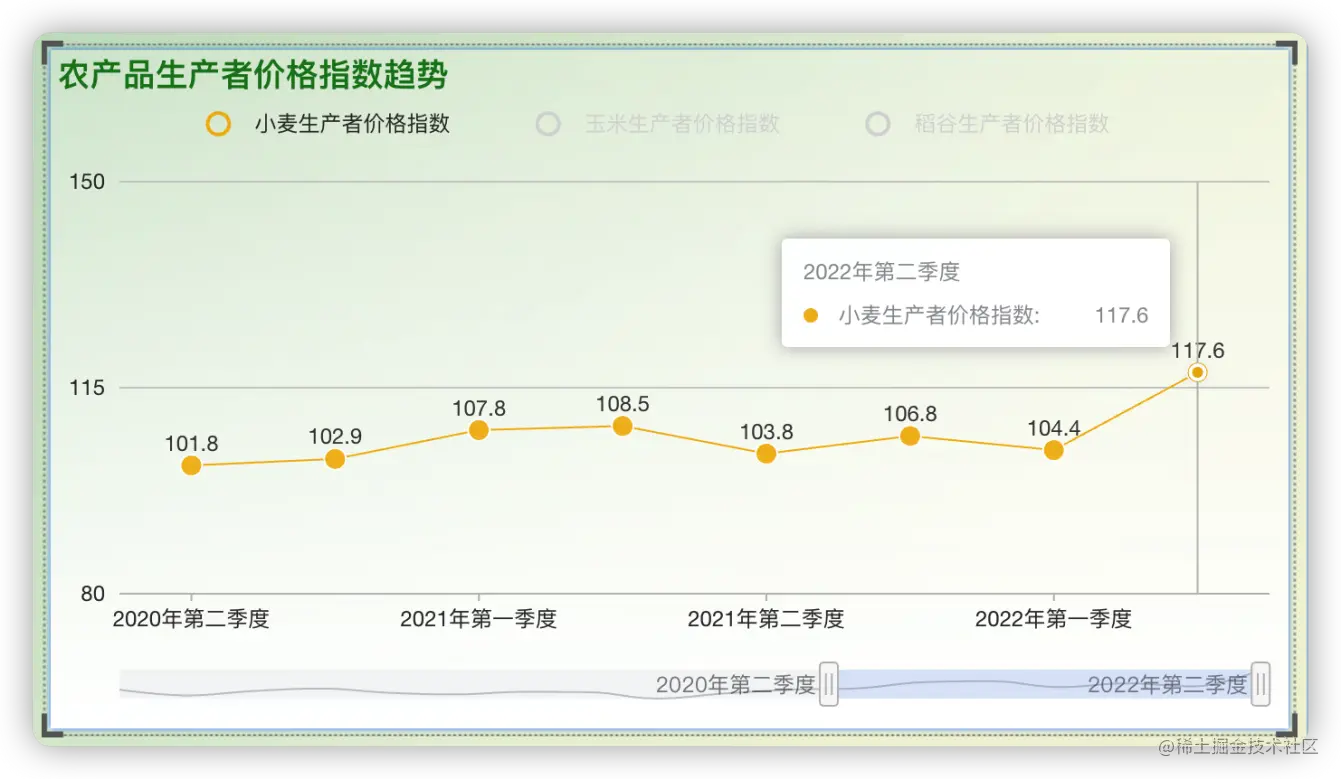 从“农产品生产者价格指数趋势”图中可以看到,2022年第二季度国内小麦价格不断冲击历史新高,生产者价格指数由第一季度的104.4上涨到117.6,价格同比涨幅创下近20年来最大涨幅。