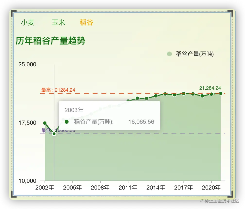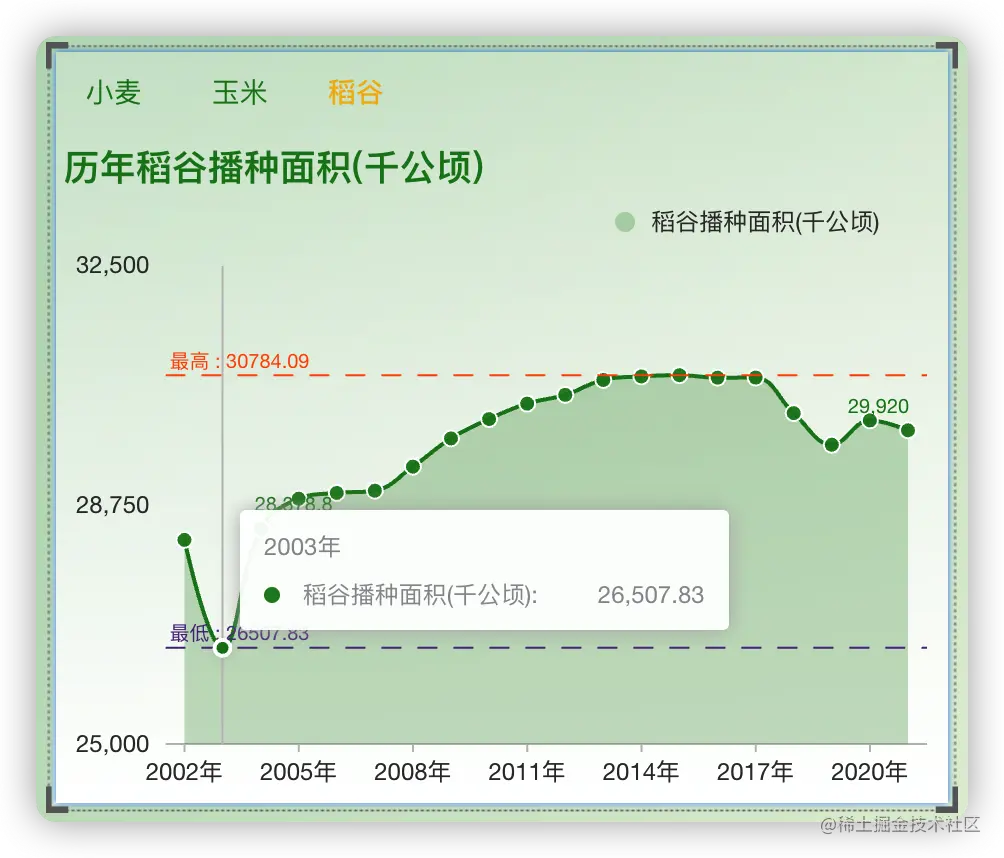 从稻谷播种面积和产量图表中可以看到,稻谷播种面积最低的是2003年为26507.83千公顷。播种面积最高的是2015年为30784.09千公顷。稻谷产量最低的是2003年为16065.56万吨,产量最高的为2021年为21284.24万吨。
