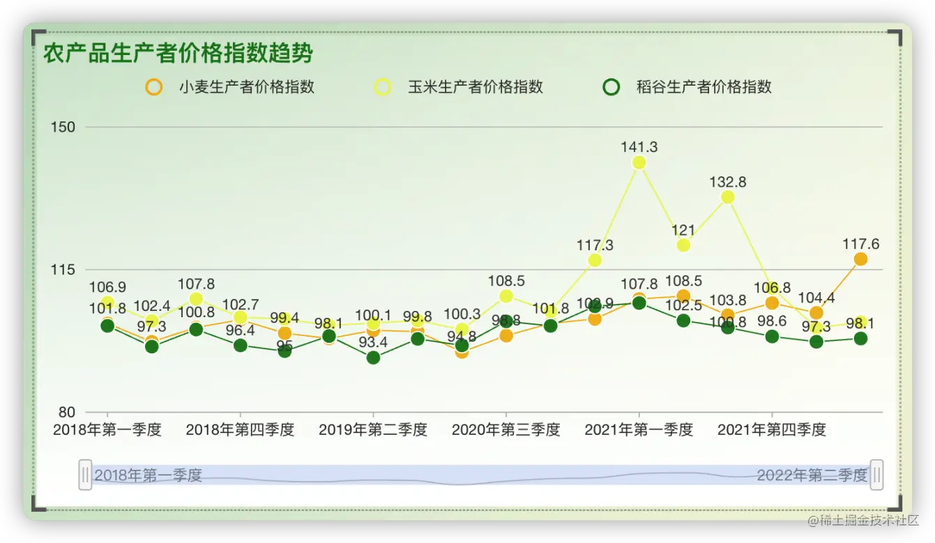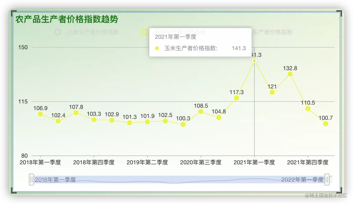 从数据图表中可以看到,2021年第一季度玉米生产者价格指数达到了141.3,这主要是受到供需关系的影响。