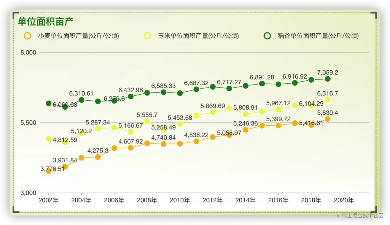 从小麦、玉米、稻谷的图表中可以看到,2016年、2017年开始农作物的播种面积是呈下降趋势的,但是产量却呈上升趋势。另外,从单位面积产量的维度,可以看到小麦、玉米、稻谷整体的单位面积亩产量均呈现上升趋势。