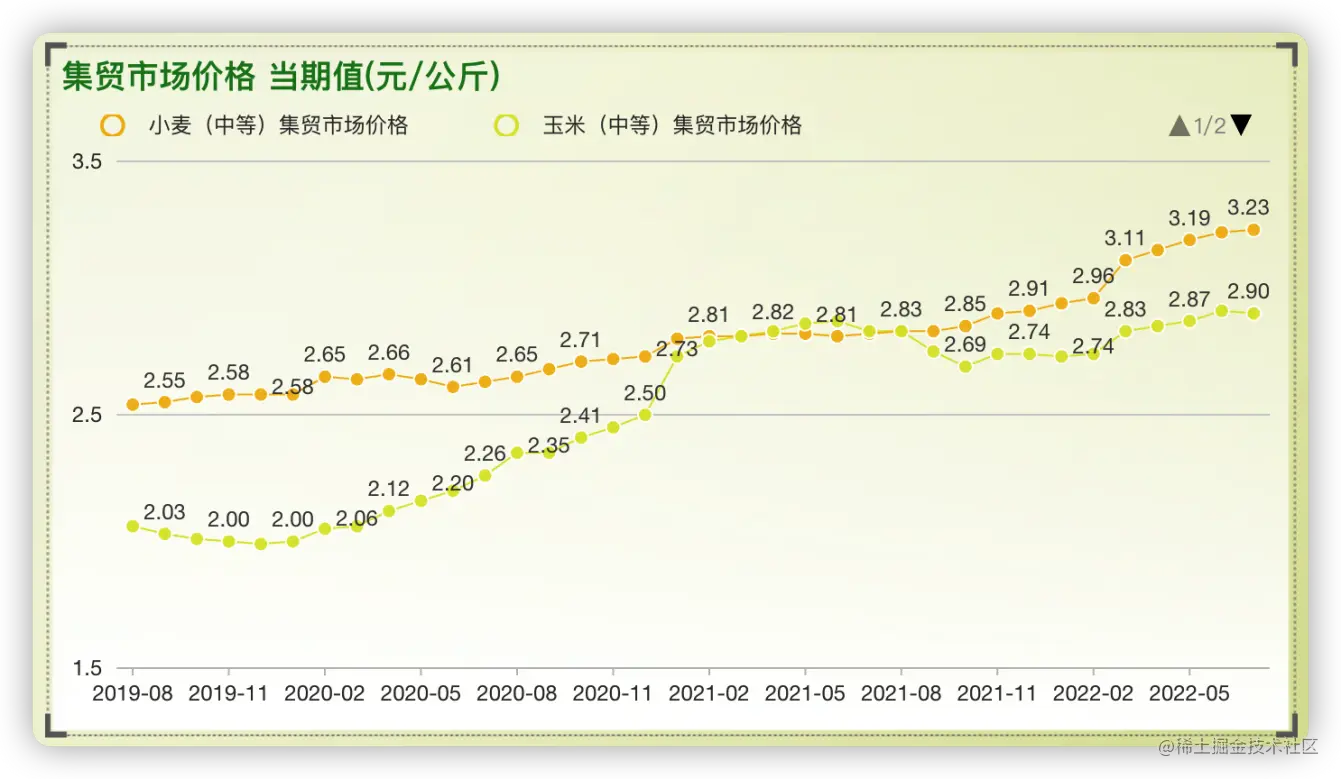 从集贸市场价格统计的近三年的数据中,可以看到从2019年8月至2022年7月,小麦、玉米、价格都呈现上升趋势,其中玉米在2019年至2021年1月上涨幅度较大,而2021年至2022年7月价格整体呈缓慢上涨的趋势。