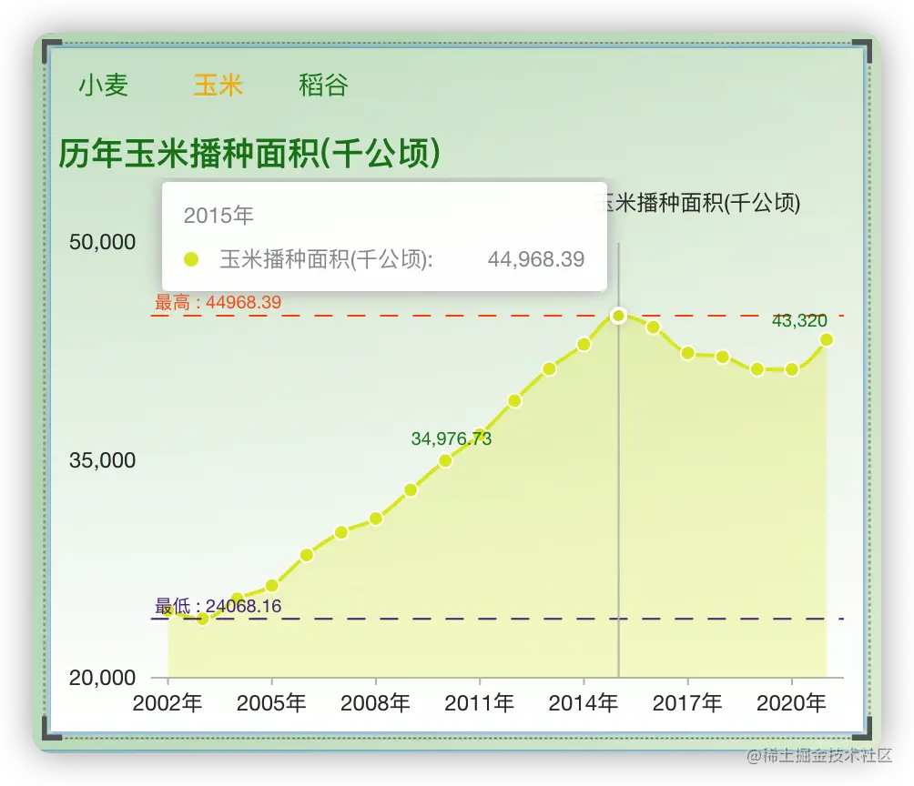 在这个农业主题仪表板的制作过程中,主要使用了DataEase开源数据可视化分析工具的自定义视图组件,其中涉及到折线图、玫瑰图等多种图表类型,视图支持联动和下钻。