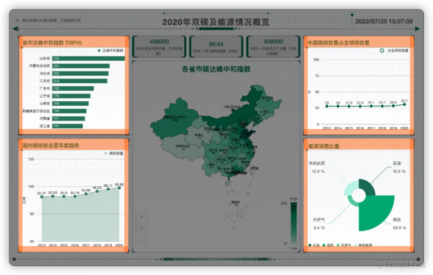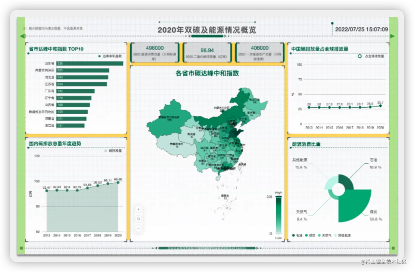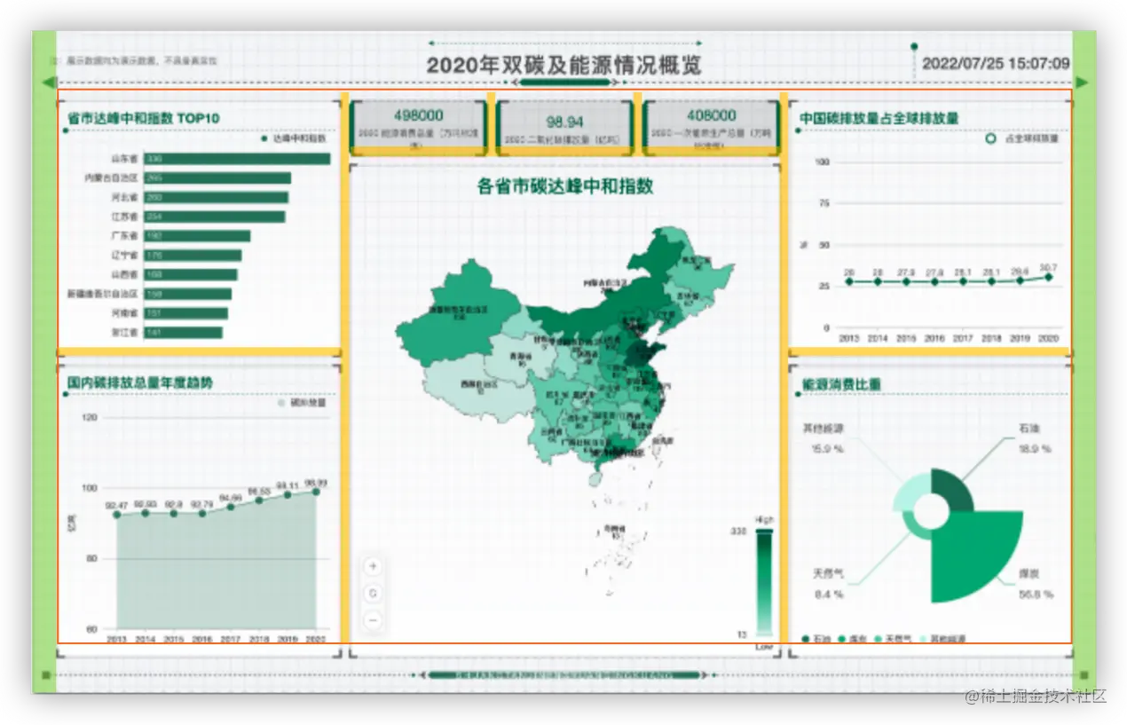 配色、布局、图表选择这些大家都可以直观的感受到,因此在数据大屏的配色和布局方面,大家无意识的都会动脑筋想如何可以配色更加舒服、布局更加合理。因为脑子里有这个意识,所以也会越做越好。
