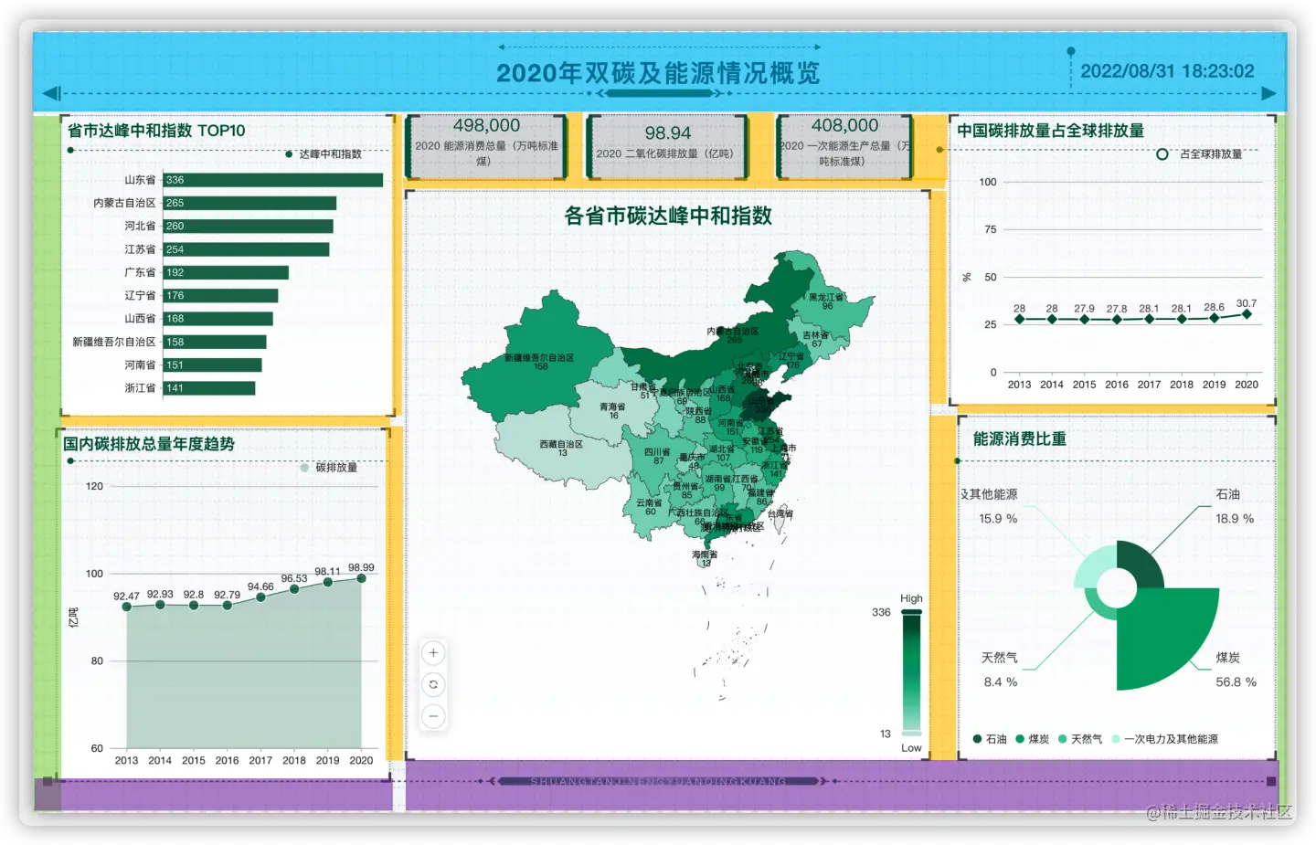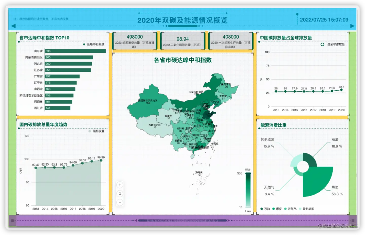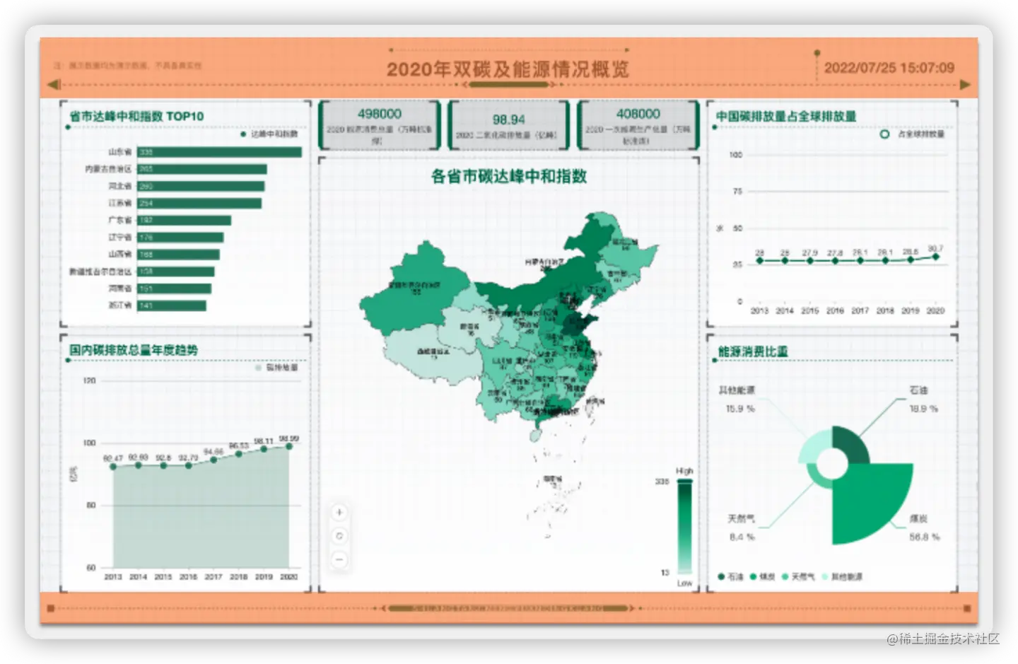 配色、布局、图表选择这些大家都可以直观的感受到,因此在数据大屏的配色和布局方面,大家无意识的都会动脑筋想如何可以配色更加舒服、布局更加合理。因为脑子里有这个意识,所以也会越做越好。