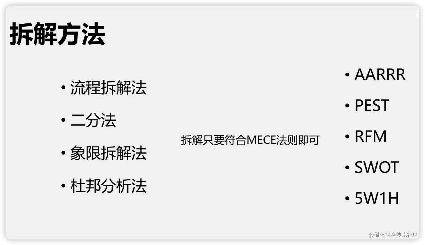 我们可以利用下面的这些拆解的方法来拆解我们的业务目标,来得到一些标准值,具体这些方法如何使用大家可以自己去学习掌握(这些框架在实际的应用场景中都是不能照搬的,都需要根据实际的使用场景进行调整)。