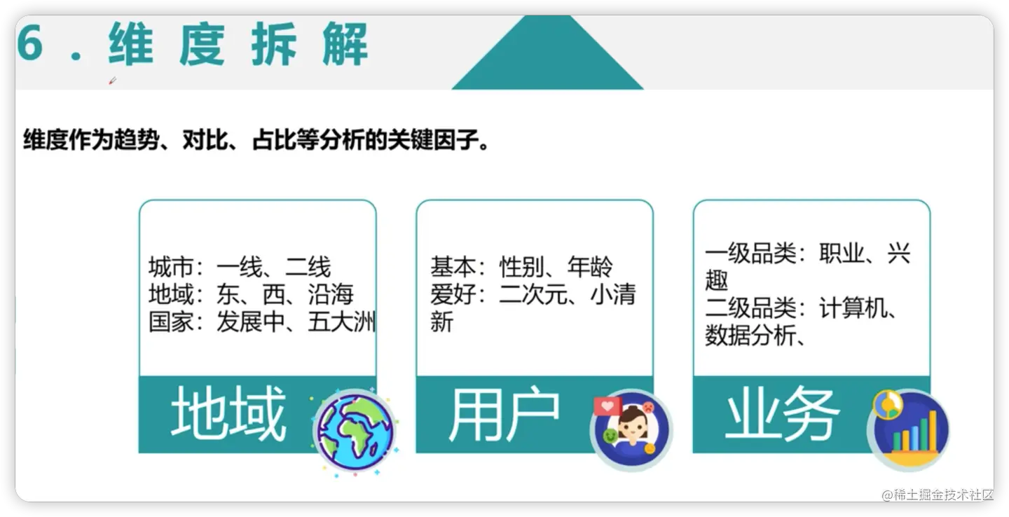 数据分析方法包括:占比分析、趋势分析、对比分析、象限分析、排名分析、维度拆解。