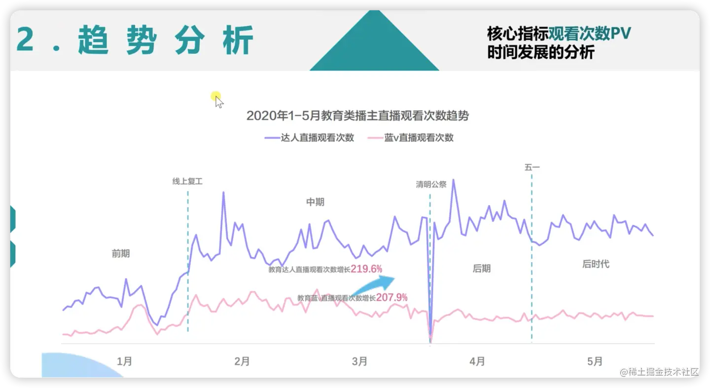 2、根据核心指标(观看次数PV)对业务趋势进行分析,可通过分析趋势异常拐点以及曲线波动出现的原因,来发现规律。