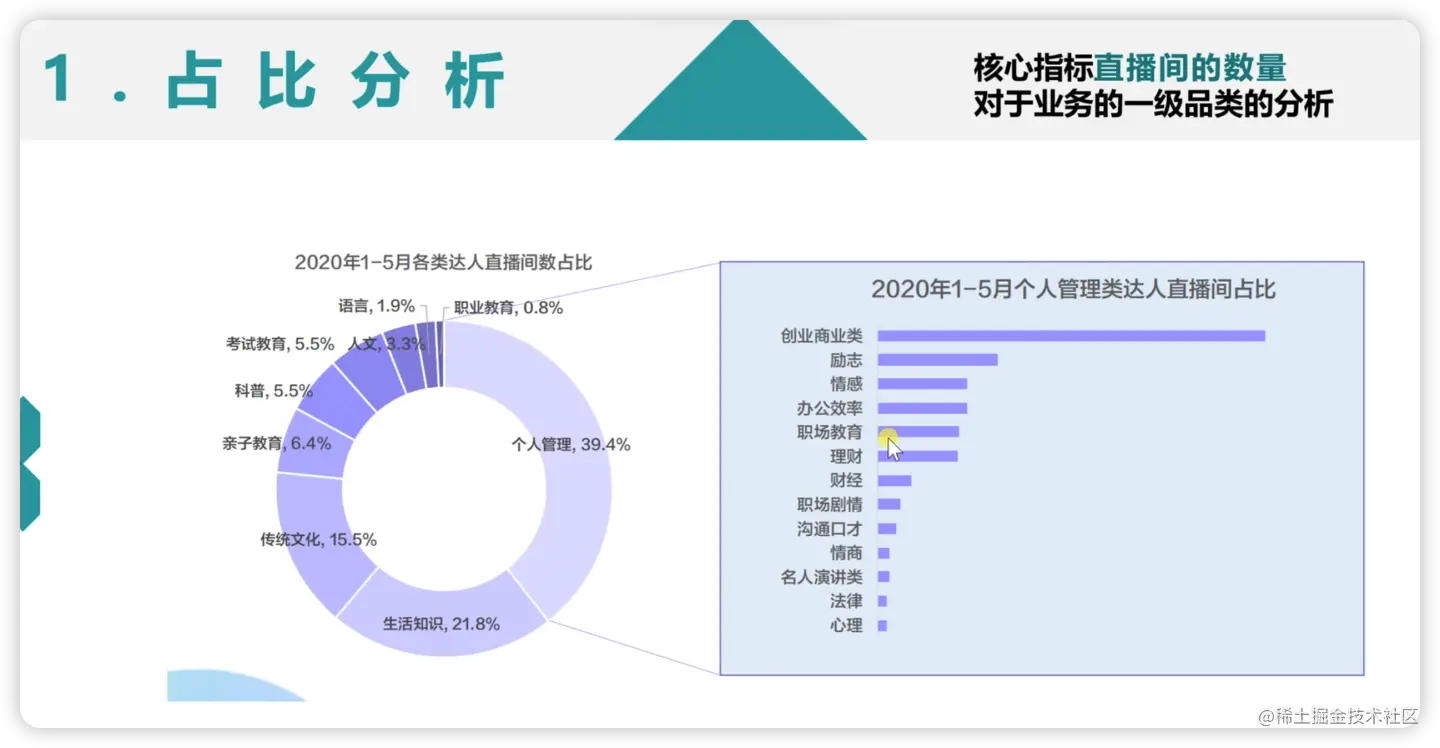 1、根据核心指标(直播间数量)对业务的一级品类进行占比分析。