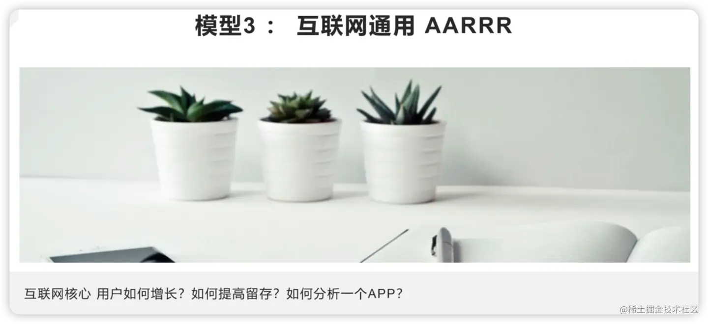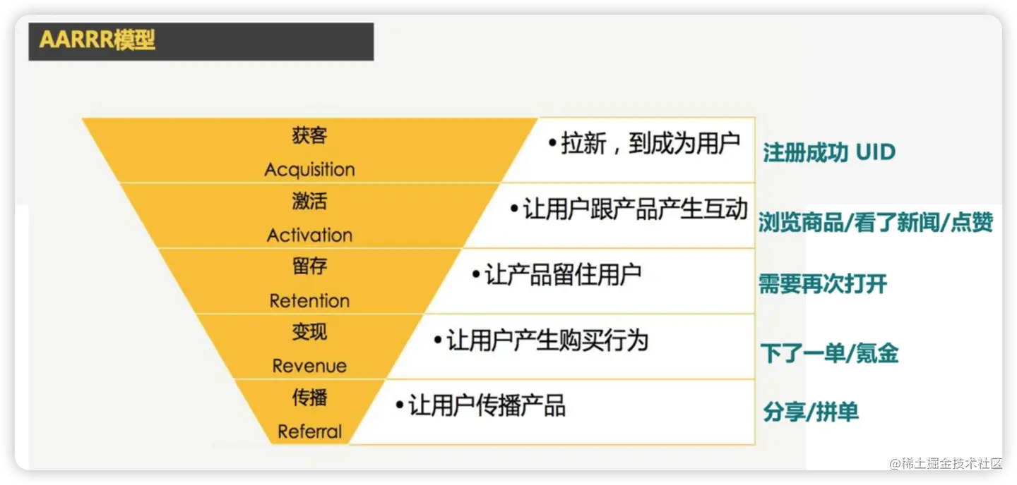 AARRR模型中每一个步骤都有一两个关键的指标:比如留存步骤中的留存率,变现步骤的变现率,传播中的引客因子(一个人可以传播几个人)等等,感兴趣可以自己进一步详细了解。