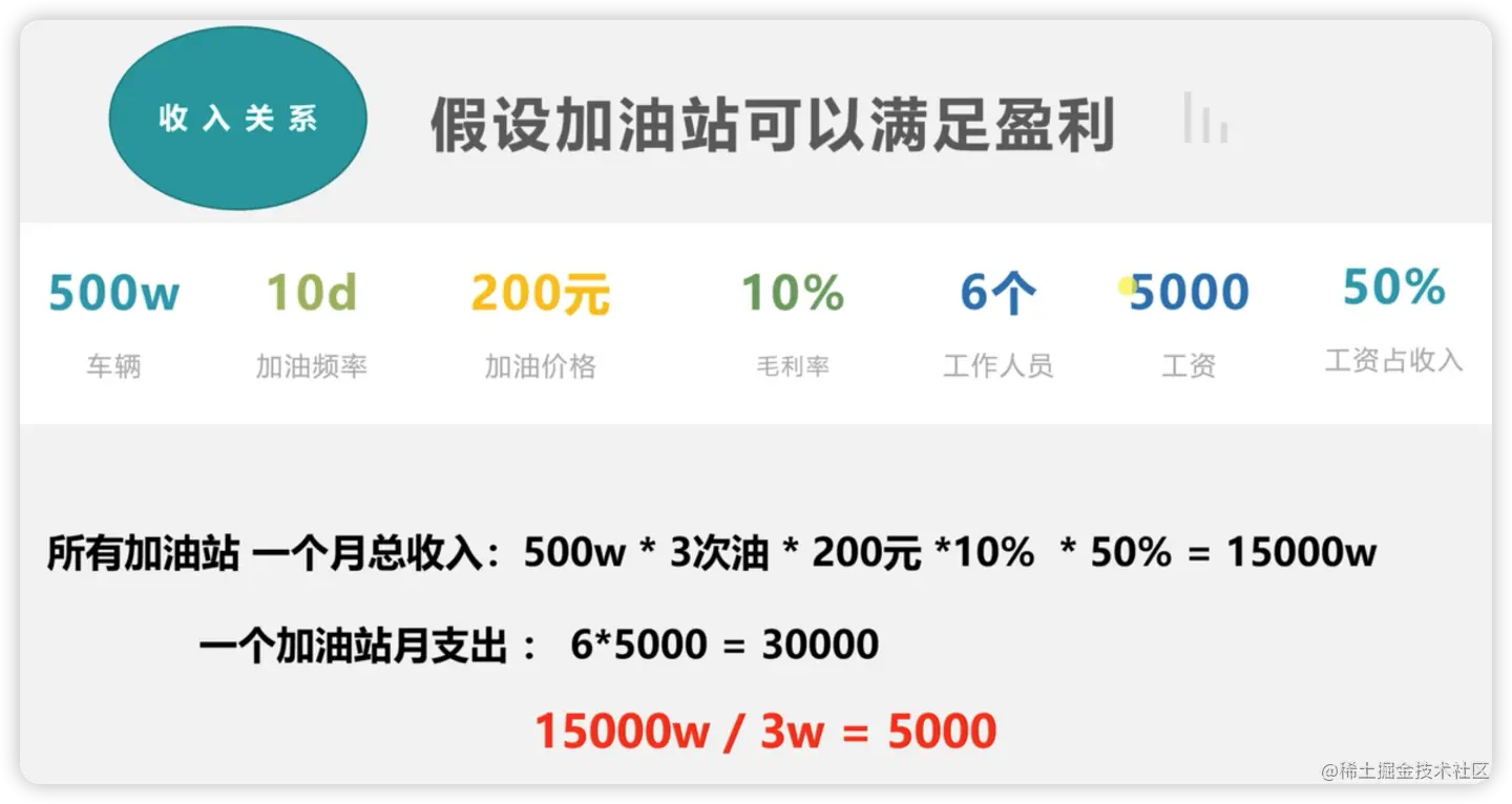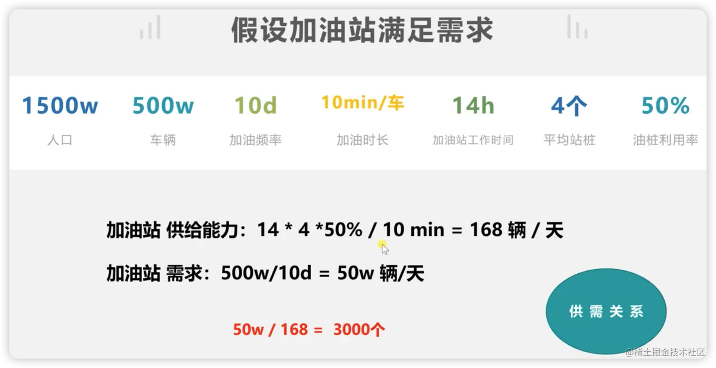 从供需关系的角度能解决80%的费米问题,有多少追求就有多少的动机。我们假设加油站能满足需求,然后基于我们已知的信息,计算一个加油站的供给能力,加油站的需求量,最后 需求除以一个加油站的供给能力,就能得到所需的加油站数量。