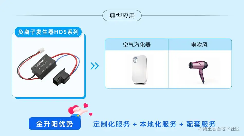 为满足市场日益增多的负离子产品需求,且终端应用客户期望小型化,携带便捷,金升阳重磅推出负离子发生器产品HO5系列。该系列产品具有超小体积、可产生高浓度负离子、低功耗等特点,适用于各种需要产生负离子浓度的终端设备,让负离子健康系列产品加快走进大众生活。