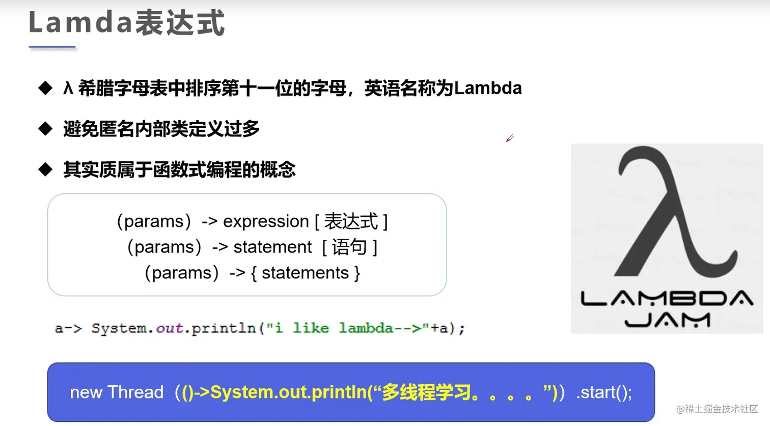 1 lambda表达式只能有一行代码的情况下才能简化成一行,如果有多行,那么就用代码块({}花括号)包裹