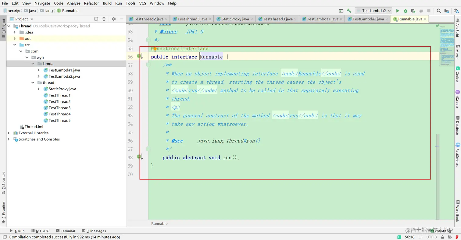 //比如Runnable接口中的run方法 一个接口只有唯一一个抽象方法,就是函数式接口,就可以用lamda表达式创建该接口的对象