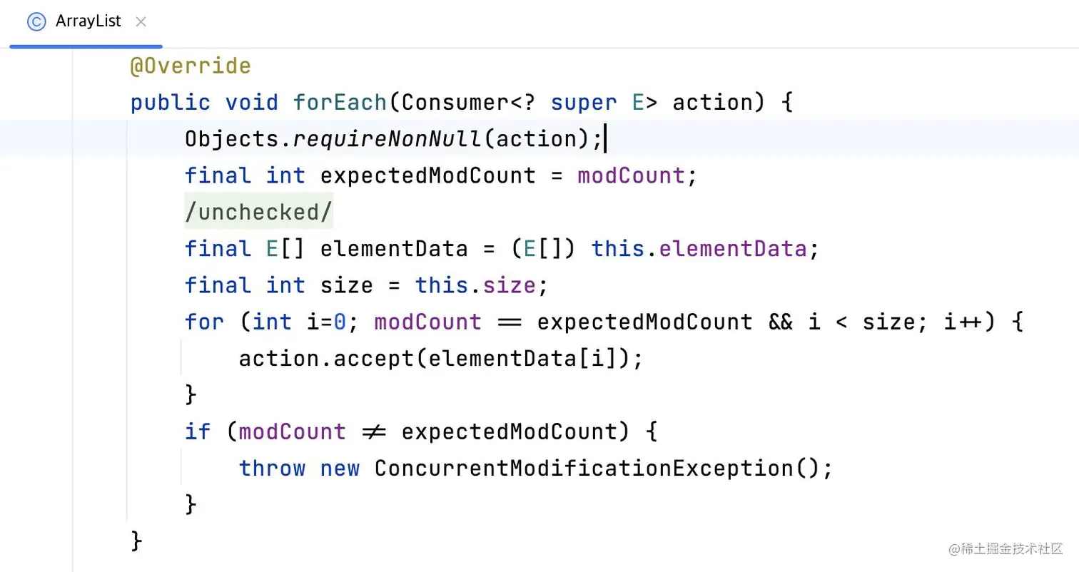 点开foreach方法可以看到该方法接受了一个Consumer<? super E> action参数。
