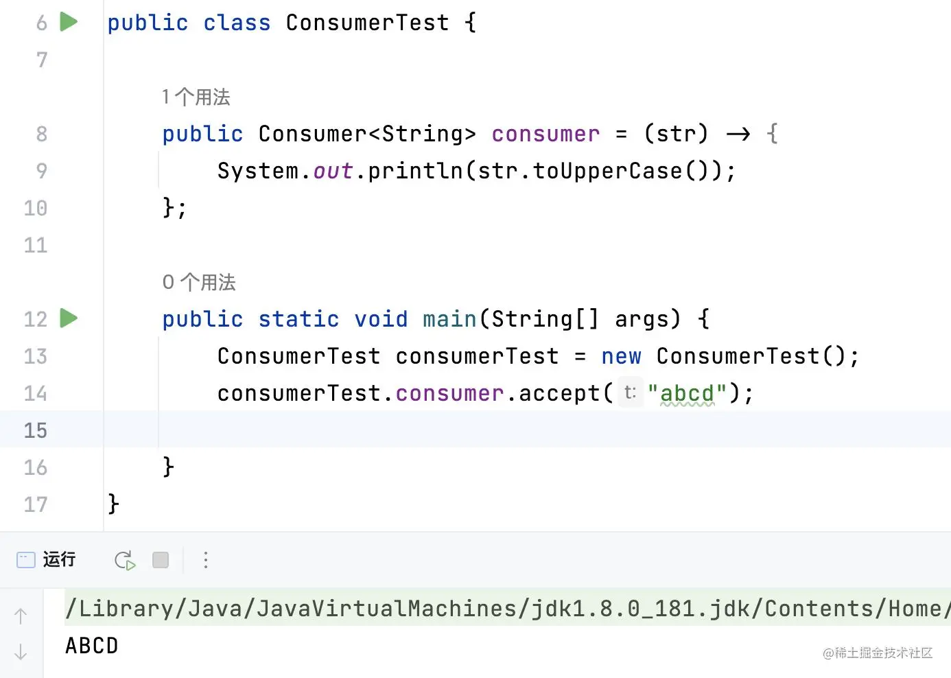 Consumer接口会接受一个输入参数,但是不会有返回结果,一般用于对某个输入对象做一些加工操作。