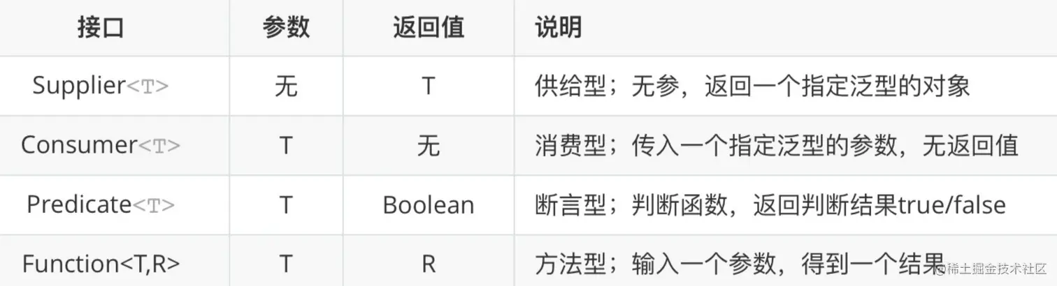 包中的接口虽然多,但是大致可以分为4大类,分别是Consumer(消费型)、Supplier(供给型)、Predicate(谓词型)、Function(功能型)。