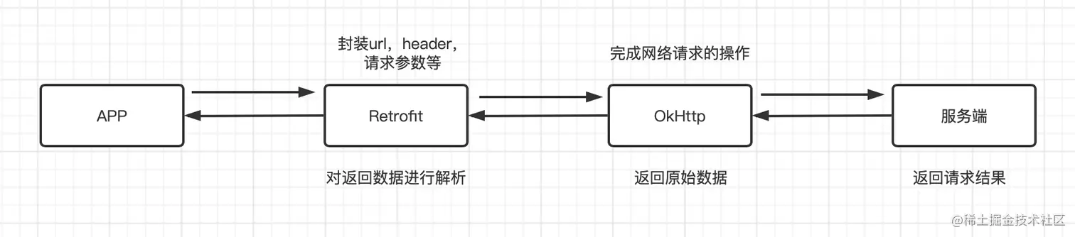 - APP通过Retrofit请求网络,实际上是使用Retrofit接口层封装请求参数,请求头,URL等信息,最后是由OkHttp完成后续的请求操作
