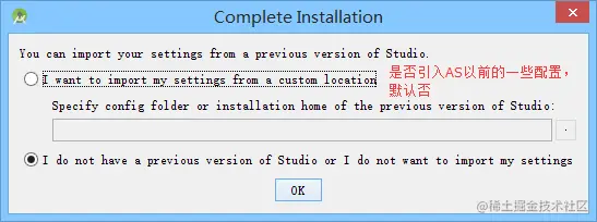 安装完毕后,打开我们的Android Studio,第一次启动需要下载SDK等一些东西,时间比较长。