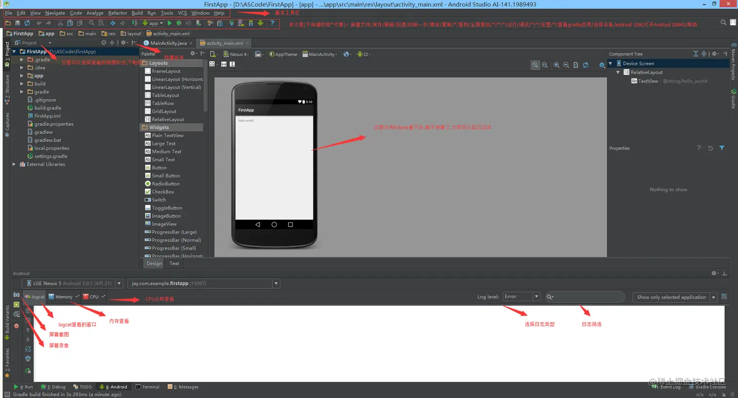 Android Studio的用法还是比较简单的,目前我也是刚用Android Studio,后续还会写一篇更深入一点的文章,这里大家琢磨琢磨,暂时能跑起程序,知道在哪里写代码,怎么看Logcat就可以了!