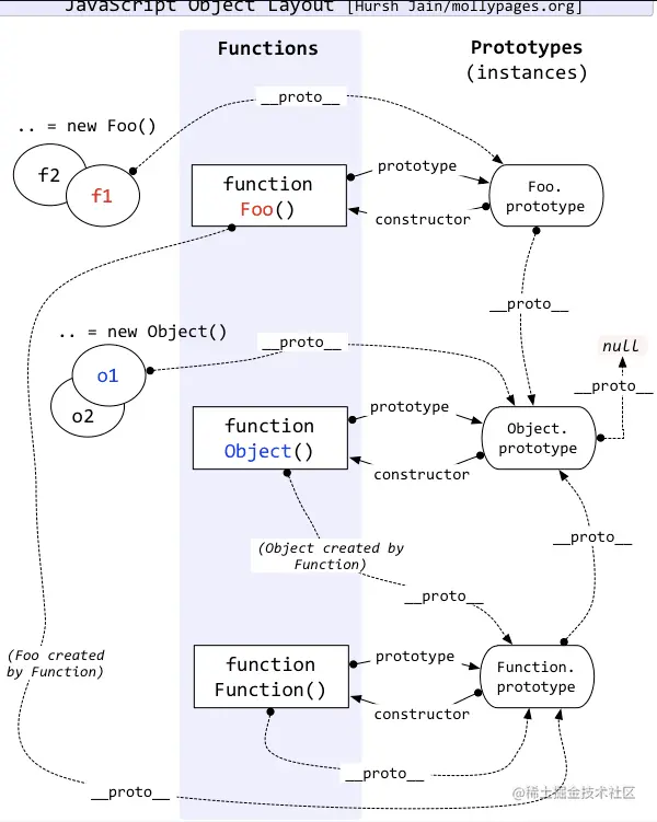 虽然这张图看着有些许的复杂,但千万不要被吓到,让我们来仔细分析一下。 (1)构造函数 Foo 上存在 Foo.prototype 原型,而 Foo.prototype 原型中的 constructor 属性又指向构造函数,就有了如图: