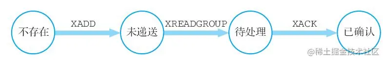 XREADGROUP命令在读取消息的同时,还会将该消息分别添加到消费者组的待处理消息队列以及消费者的待处理消息队列中,从而使得被读取消息的状态从原来的“未递送”转变成“待处理”。