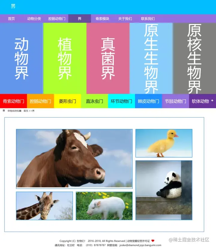 最上面有header,主要是包含标题,往右边是返回主页和动物界按钮,按钮使用了float right 布局
