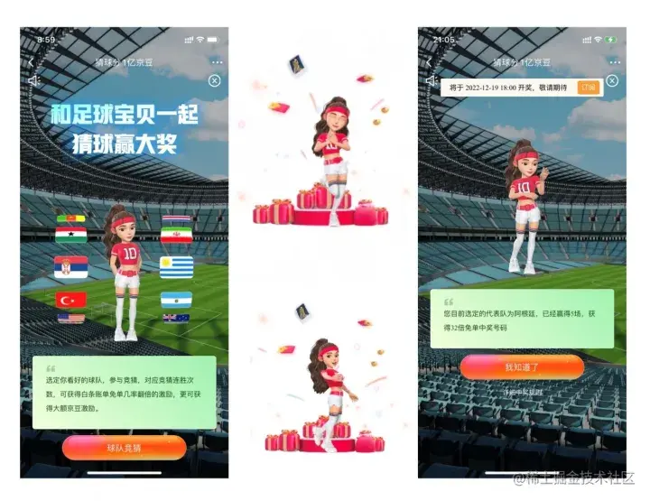 最终我们结合用户、产品、业务多个视角,综合评估最终的呈现效果及研发成本,决定以从未选择球队、选择球队被淘汰、开奖结果三个场景加入数字人交互,来贯穿整个世界杯营销活动,既覆盖了核心场景,又避免过度关怀造成对用户打扰。同时我们的数字人选用了贴近“足球宝贝”的卡通形象,动作设计方面也诠释了“青春活泼可爱”的设定,并且让数字人常驻在活动页面,增加世界杯的氛围感,以及对用户的陪伴。