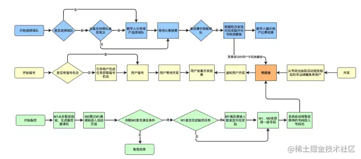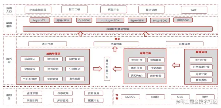 本次营销活动的主要玩法是用户进入页面后会获得一次免费的摇号机会,通过摇号玩法可以获得一个“抽奖码”,每天每个用户最多可以获得5个“抽奖码”,每天只有一次免费摇号的机会,其余4次机会是用户通过完成某项任务来获得的。我们引入了世界杯热点话题,通过猜球输赢的形式来给自己的号码池做一个翻倍的玩法。在猜对的同时除了能获得我们自己的号码池翻倍奖励外,还会获得额外的积分或者京豆的奖励。通过已经获得的积分可以在我们营销活动的其他楼层进行一些权益的兑换和获得。下面是我们整体系统架构图以及重点玩法流程图。
