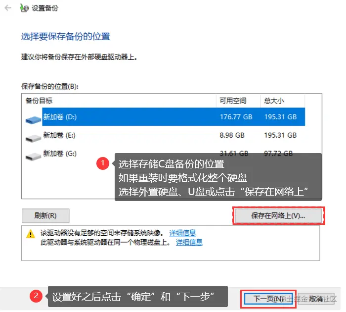 步骤4: 这时就可以选择C盘要保存的位置了。如果重装系统你要格式化所有磁盘,建议选择外置的硬盘或者U盘,也可以点击【保存在网络上】,有三个选项可以供你选择。设置成功,就可以点击【下一步】;