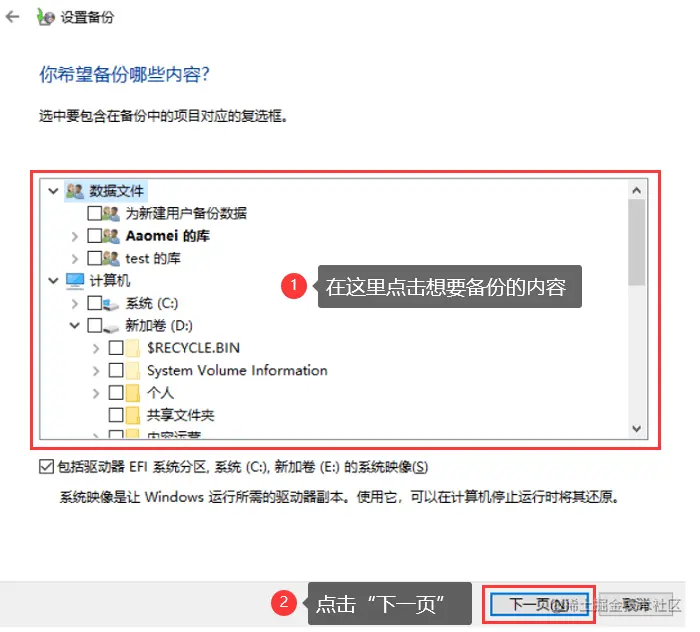 步骤5: 在页面方框内选择你要备份的数据(可以选择整个C盘),单击【下一页】;