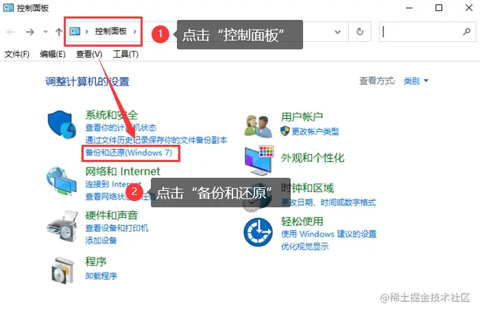 步骤2: 在搜索框输入【控制面板】,打开页面,在里面找到【系统和安全】,点击【备份和还原】;