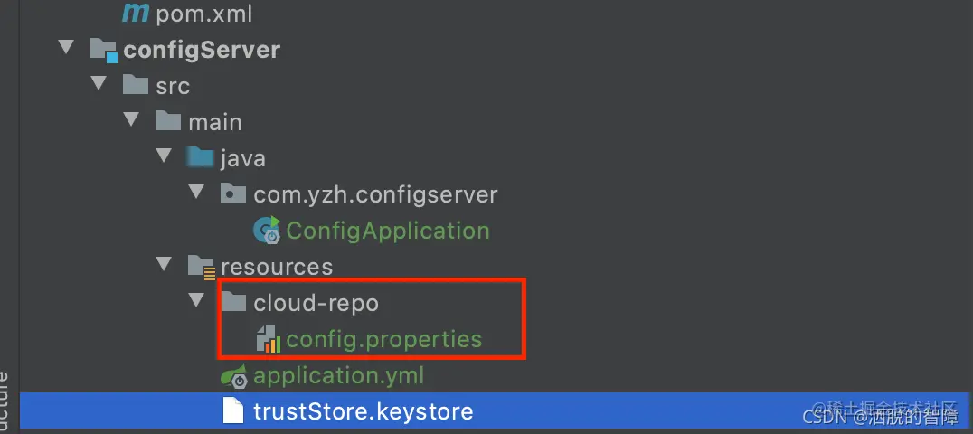 spring: application: name: config-server profiles: active: native # 本地模式 cloud: config: server: native: search-locations: classpath:/cloud-repo # 指定目录方式 server: port: 8888我这边在项目的resources目录下新建了一个cloud-repo目录,用于存储读取的配置文件信息。