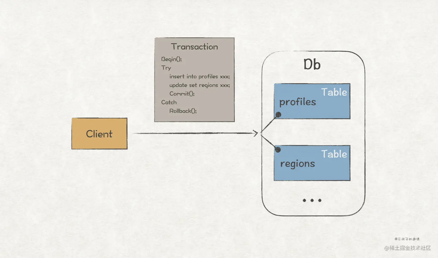 在 简单的分布式应用系统(示例代码工程)中,db 模块用来存储服务注册信息和系统监控数据。其中,服务注册信息拆成了 profiles 和 regions 两个表,在服务发现的业务逻辑中,通常需要同时操作两个表,为了避免两个表数据不一致的问题,db 模块需要提供事务功能: