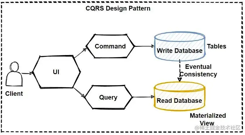 CQRS 架构可分为 命令端 和 查询端,其中命令端负责数据的更新;查询端负责数据的查询。命令端的写数据库在数据更新时,会向查询端的只读数据库发送一个同步数据的事件,保证数据的最终一致性。