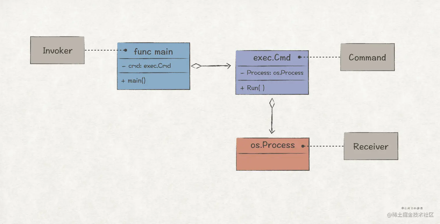 在上述例子中,我们通过 exec.Command 方法将一个 shell 命令转换成一个命令对象 exec.Cmd,其中的 Cmd.Run() 方法即是命令执行方法;而 main() 函数,对应到命令模式中的 Invoker;Receiver 则是操作系统执行 shell 命令的具体进程,从 exec.Cmd 的源码中可以看到: