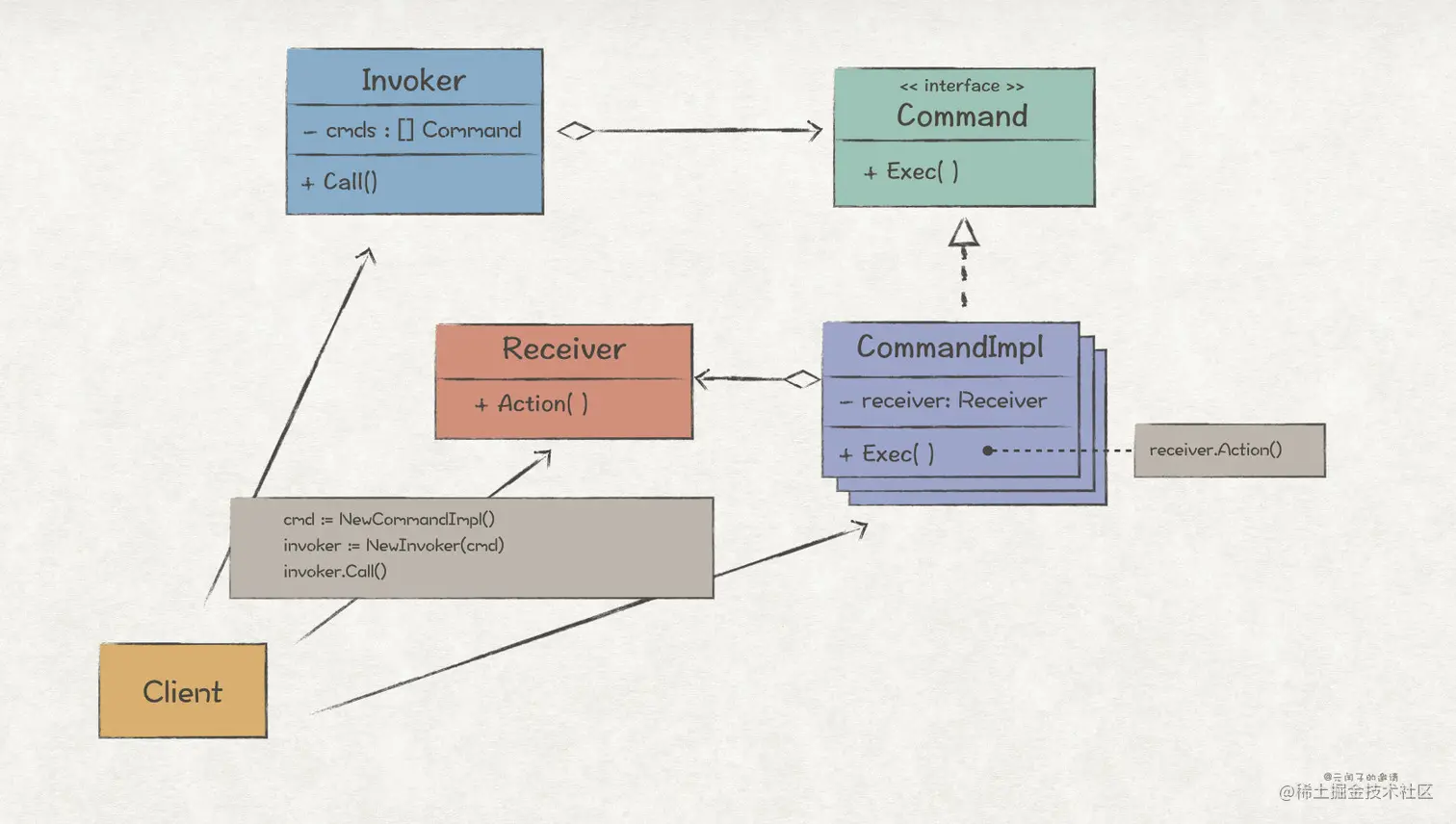 - Command,命令,是对请求的抽象。具体的命令实现时,通常会引用 Receiver。