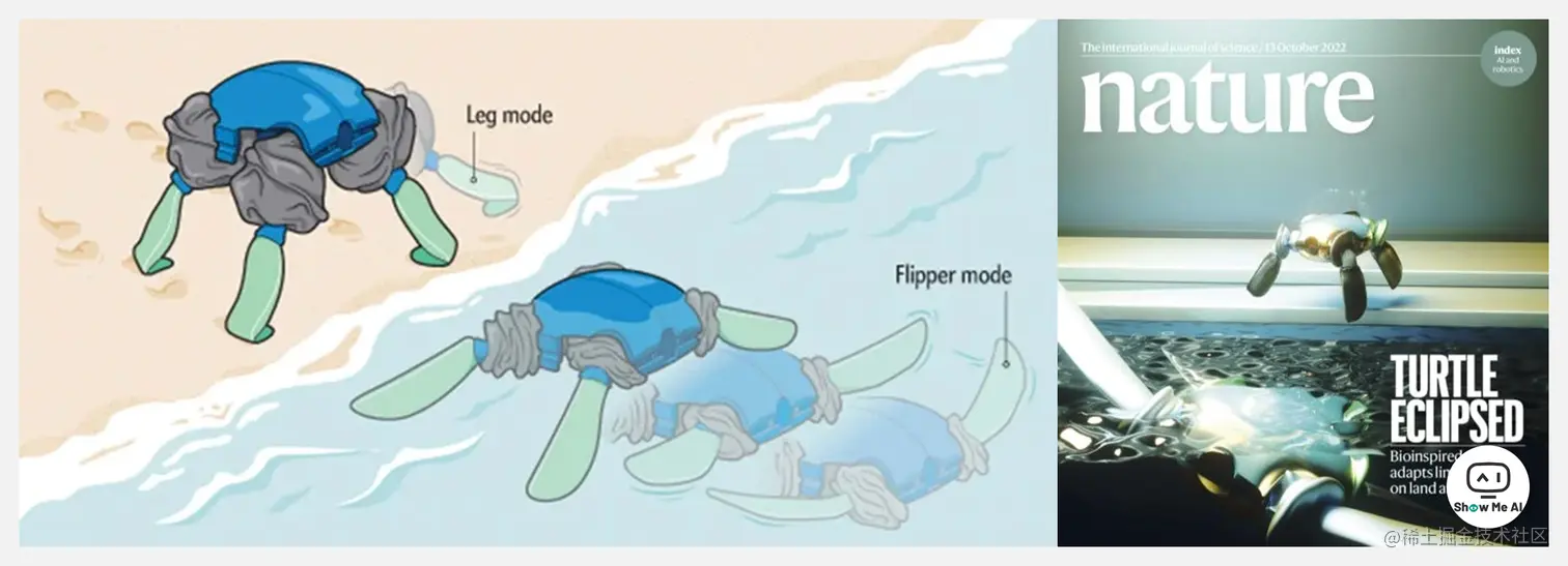 该机器龟结合了两者的特点,其具有可变形的四肢,能够根据周围环境调整四肢形状、刚度和动作。当将机器龟从一种环境过渡到另一种环境时,其四肢使用可变刚度材料和人造肌肉来改变其形状:在陆地上爬行或者在水中划行。
