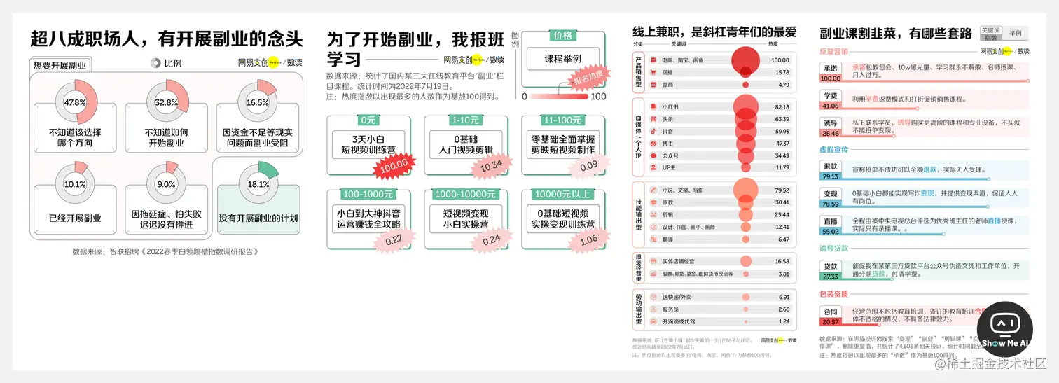 百度指数显示,自 2019 年 8 月以来,“副业”的搜索度和关注度一路攀升。超过 8 成的白领有意开展副业,其中电商、自媒体和写作的热度指数位列前三。为了能够早日实现副业梦,不少人选择报名培训班,却一不留神就被割韭菜。事实上,往往只有少数的头部大神能够做到副业取代主业,部分人赚点零花钱,贴补家用,但更多的人是兢兢业业,在副业道路上跌跌撞撞。(来源:网易数读)