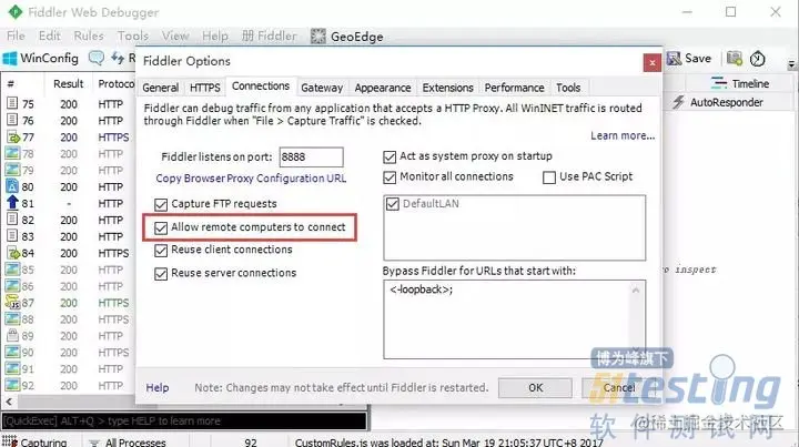 1.fiddler>Tools>Fiddler Options>Connections 勾选Allow remote computers to connect。