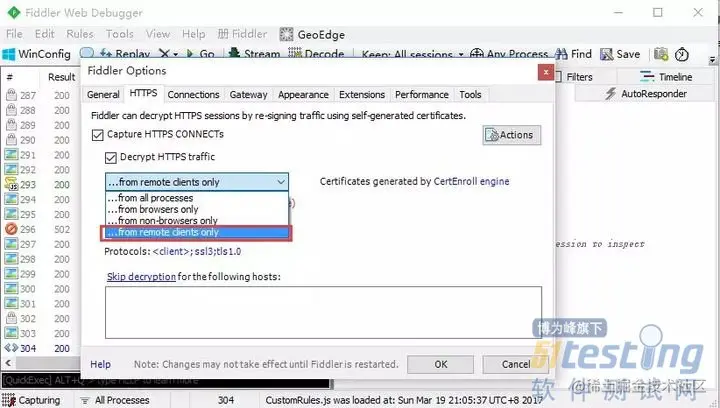 2.打开fiddler>Tools>Fiddler Options>HTTPS>...from remote clients only,勾选这个选项就可以了。