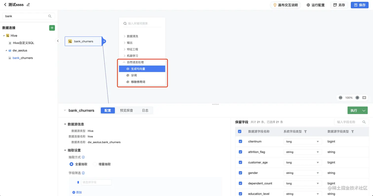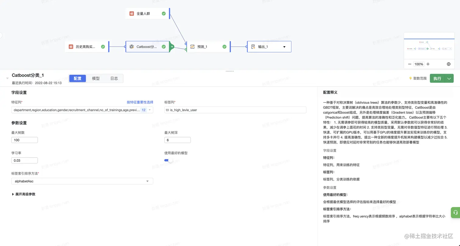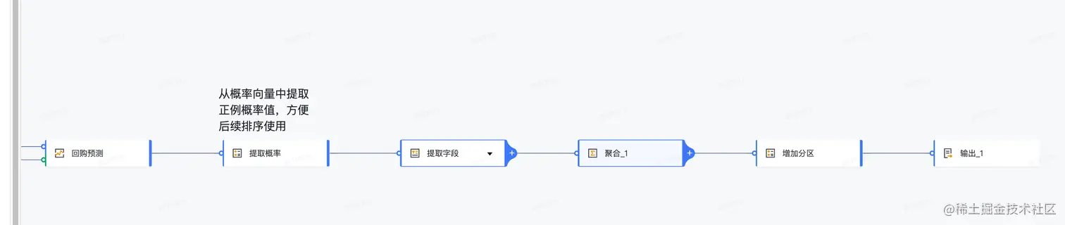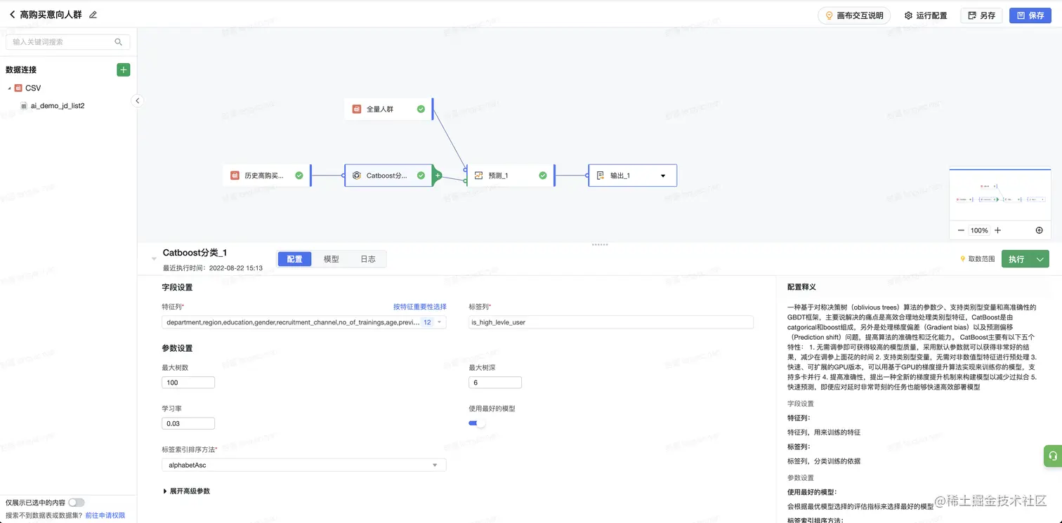 用户日常工作基本不涉及写Python,但存在做数据挖掘的需求场景。他需要基于存量高意向客户样本做客户意向度挖掘。此时可通过可视化建模构建数据挖掘流程: