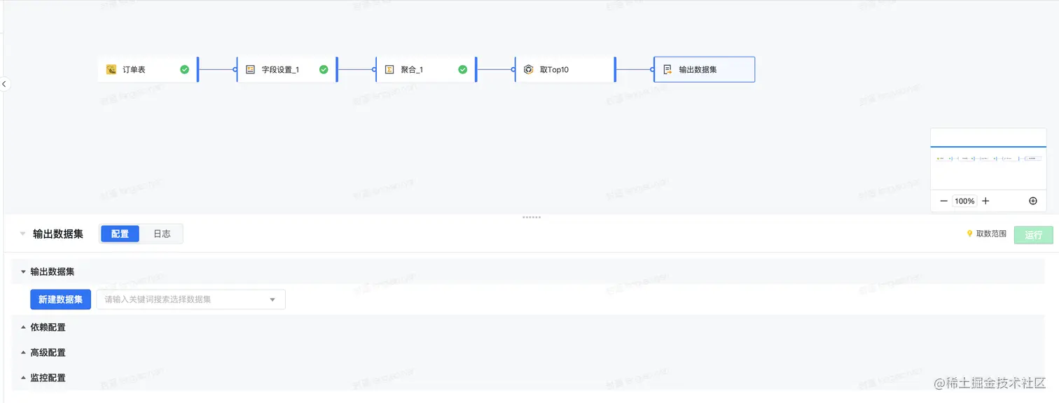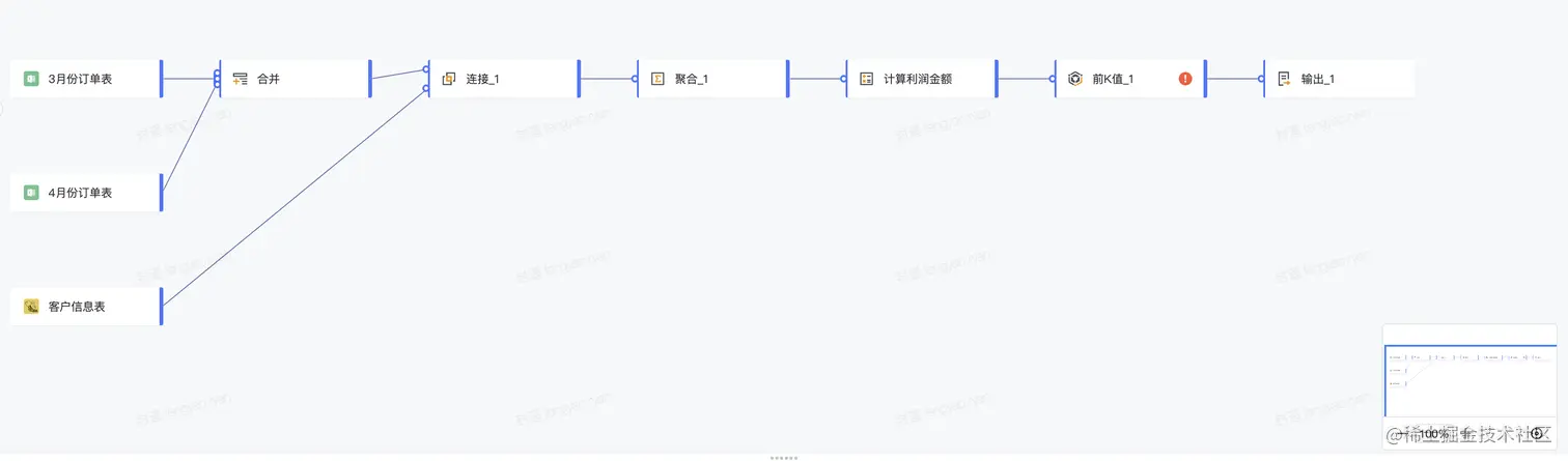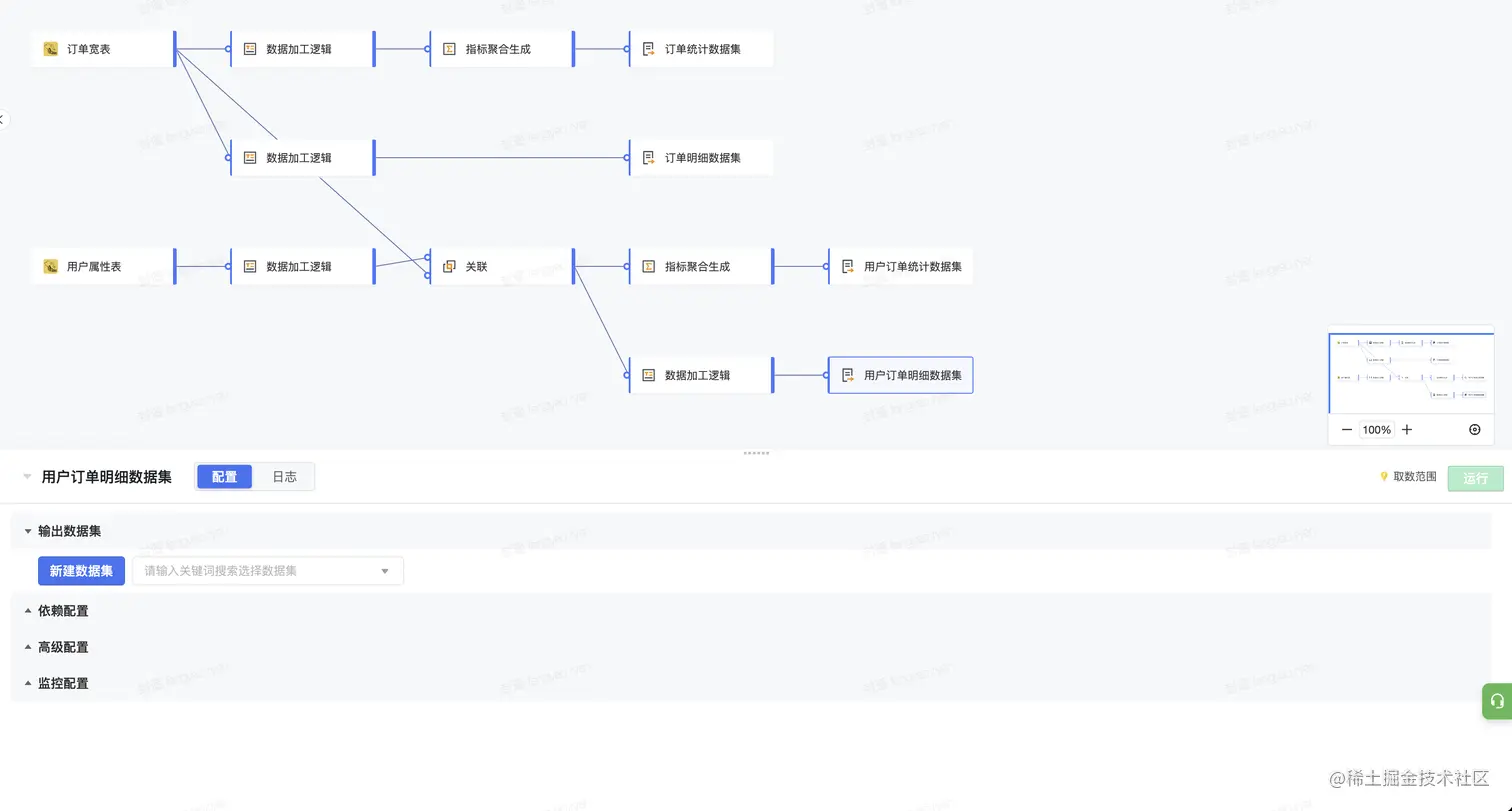 针对这一场景,DataWind的可视化建模能力也可以很好的完成。可视化建模功能支持单一数据集同时被多种逻辑处理加工生成多个数据集。以处理订单数据和用户数据为例: