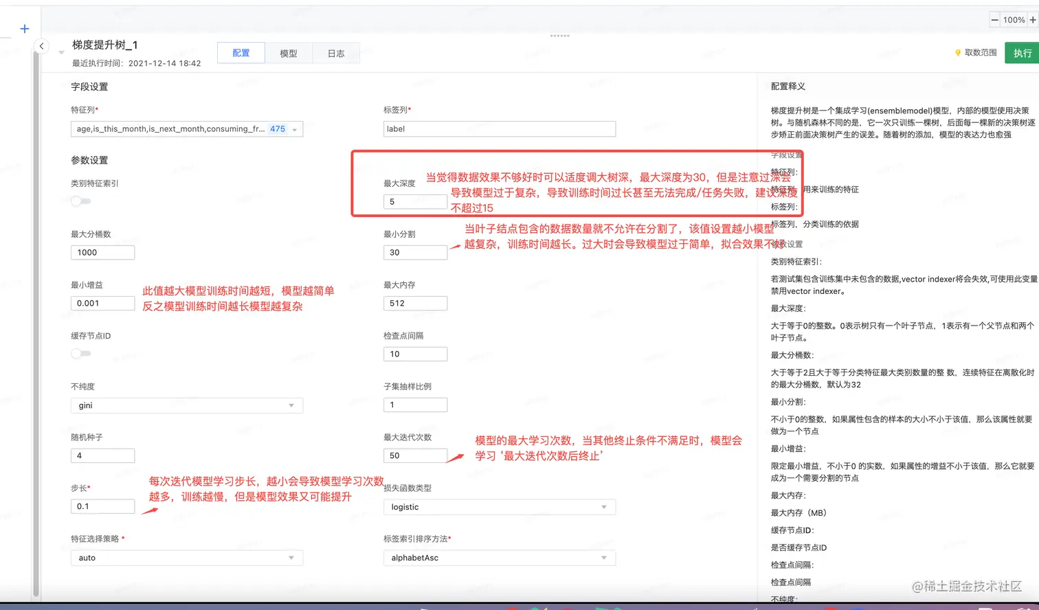 梯度提升树:负责拟合训练数据,输出一个可以用于预测的模型(图中没有标注的参数不需要维护人员修改):