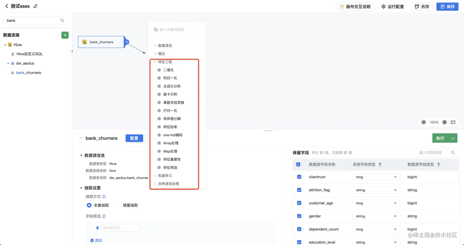 画布中支持同时构建多组画布流程,一图实现多数据建模任务的构建,提高数据建设的效率,降低任务管理成本;另外,画布中集成封装了超过40种数据清洗、特征工程算子,覆盖初阶到高阶的数据生产能力,无需Coding完成复杂的数据能力。