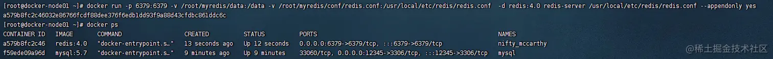 docker run -p 6379:6379 -v /root/myredis/data:/data -v /root/myredis/conf/redis.conf:/usr/local/etc/redis/redis.conf -d redis:4.0 redis-server /usr/local/etc/redis/redis.conf --appendonly yes